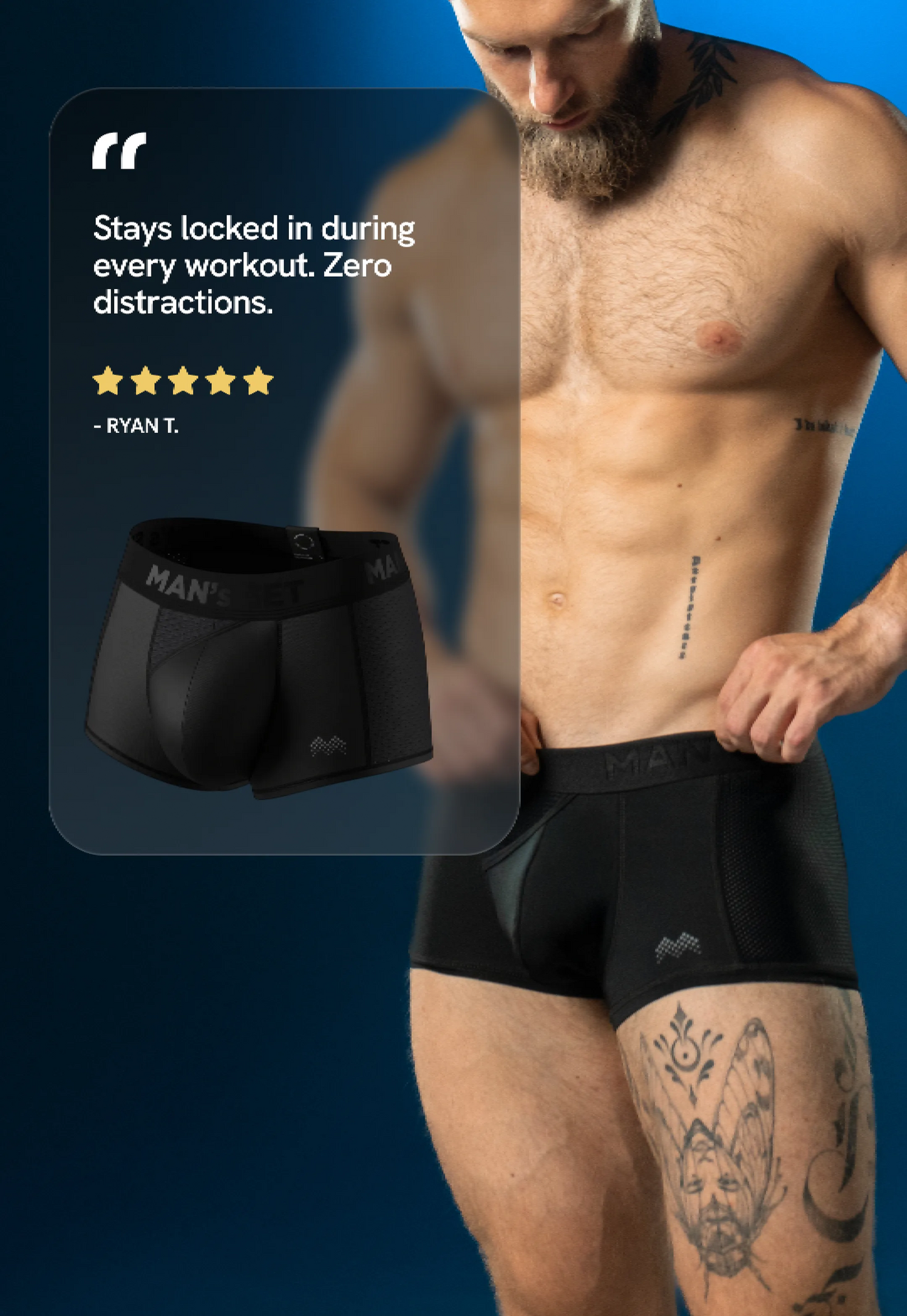 The only shorts with built-in anatomical underwear. Less bulk. More freedom. Lose the extra pair....