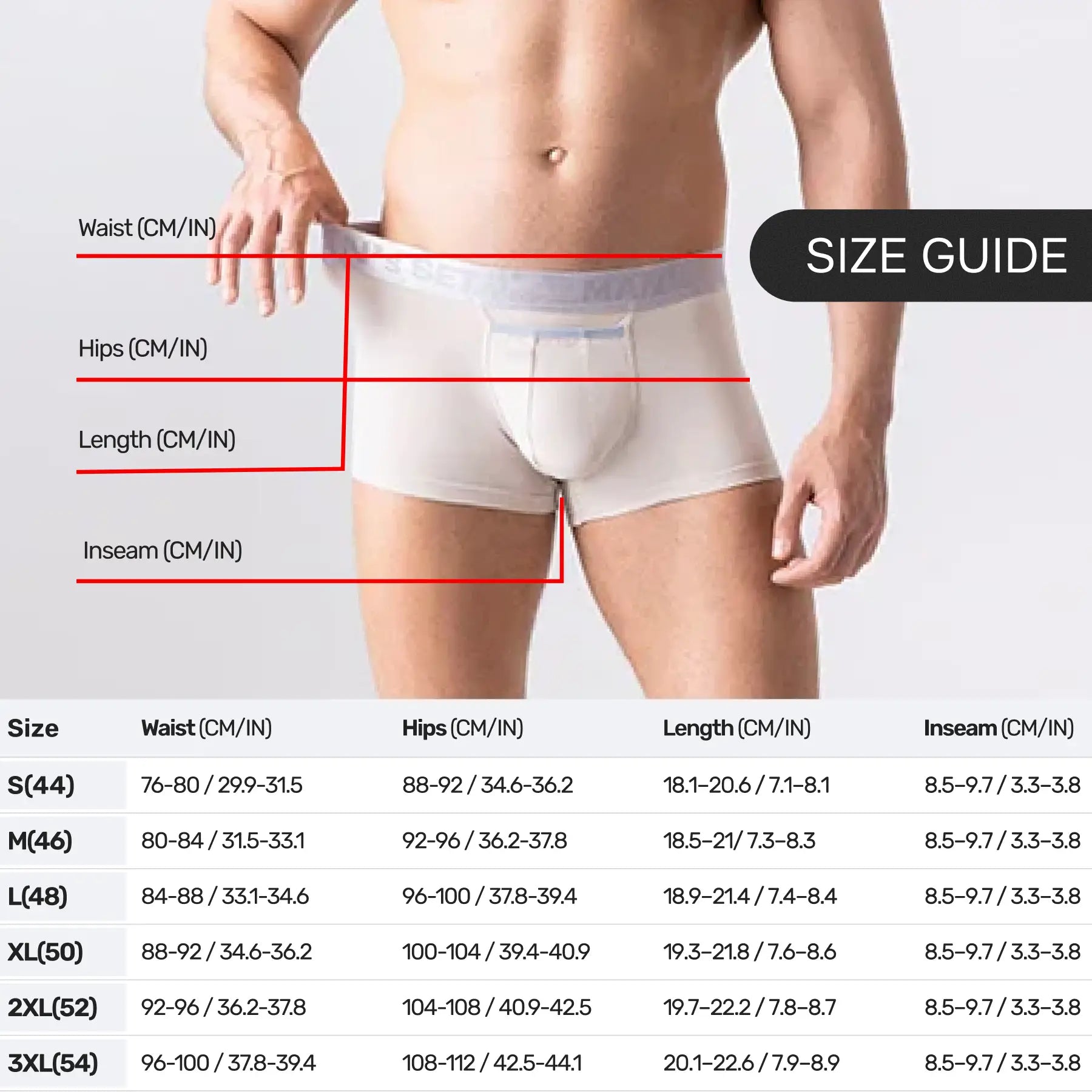 | XL (50) | 88–92 34.6–36.2 | 100–104 39.4–40.9 | 19.3–21.8 7.6–8.6 | 8.5–9.7 3.3–3.8 |